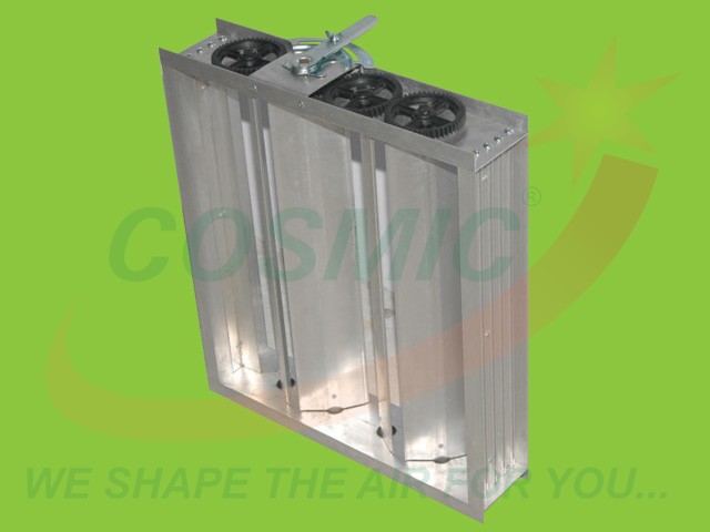 Frames and blades both are high quality extruded aluminium sections. The frame with flat frontal face to suit for flanged connections with the ducts. Frames are fixed by screws and inner blades are aerofoil type.Frames and blades are connected by means of nylon bushes and rods with gear for smooth operation in case of larger size AHU dampers, blades are connected by means of machined spindles, bushes with flat link arrangements, air volume adjusted by a lockable quadrant with status indicator, lockable screws indicating open or closed position.