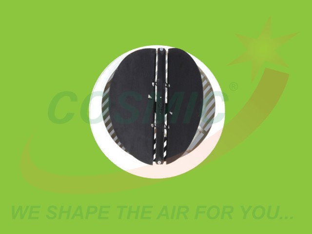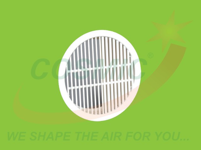 Circular frame with flat frontal face of 20 mm and inner blades are cut to match the circular area. Available in 0°,15°, 30° or 45° deflections as well as in one way or two way types. Removable cores are also made on request. For air supply screw operated two flap butterfly dampers will be fixed on the rear side of the grille. Constructed in high grade aluminium.