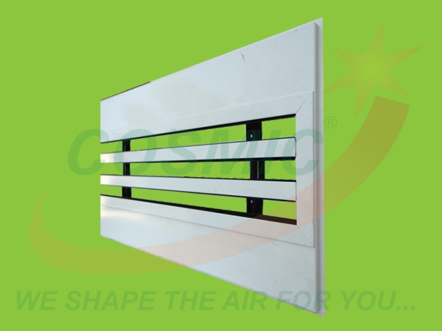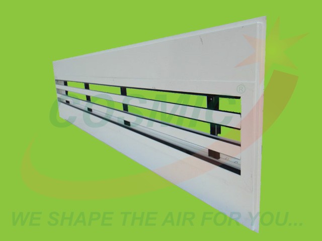 • Cosmic make Tech zone diffusers are made of high quality extruded aluminium with powder coated to standard RAL colours. Pattern control designed for easy adjustment of horizontal and vertical throws.• Cosmic make Tech zone linear slot diffusers are available in 2 slot and 3 slot configuration to suit the Tegular ceilings ( 8mm drop towards the floor) or flush armstrong ceilings. The direction of discharge can be adopted on site to the required room conditions.